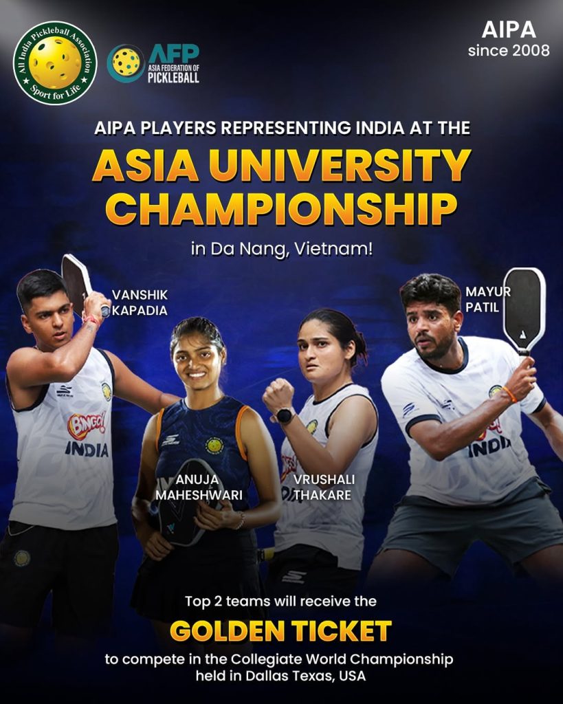 This prestigious tournament is hosted by the Asian Federation of Pickleball (AFP), and the stakes couldn’t be higher! The top two teams will earn a coveted Golden Ticket to the Collegiate World Championship in Dallas, USA! We’re already cheering loud for Team India – let’s make it count and bring home those golden tickets!